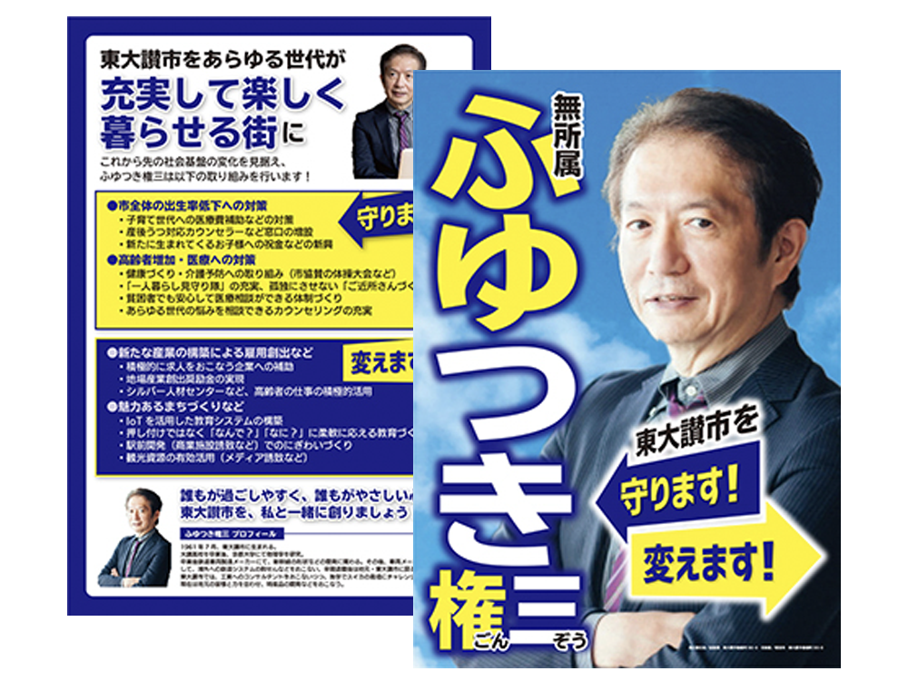 選挙関連のデザインも好評受注中。掲示板に貼って目線を誘導するポスターや、公約をわかりやすくまとめたビラ、公選はがきや事務所看板まで。