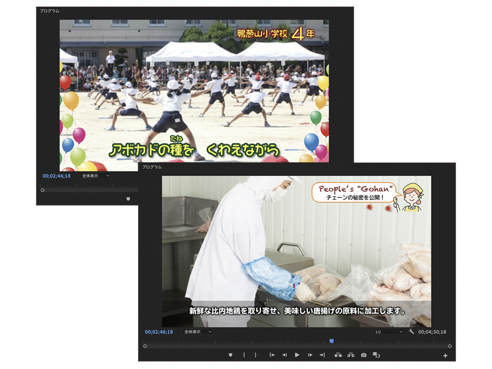 場面転換(ディゾルブ)演出や、音声に合わせたテロップ挿入はもちろん、声が反響した際の音声調整など行ないます。
